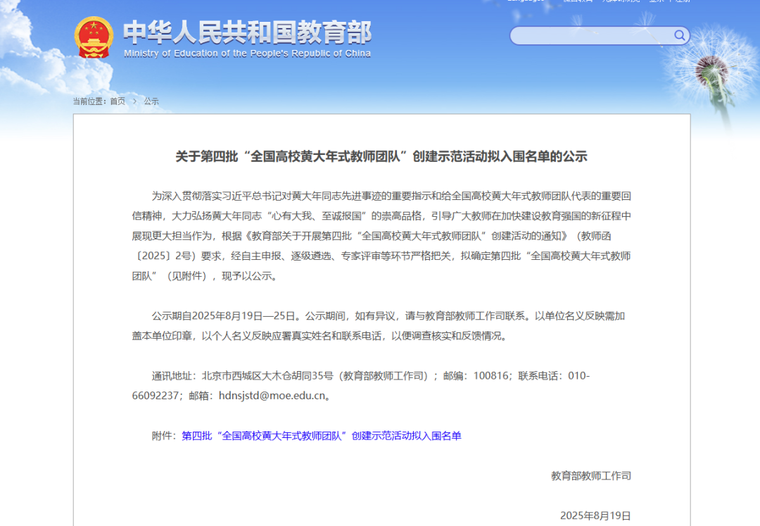 8月19日,教育部发布《关于第四批“全国高校黄大年式教师团队”创建示范活动拟入围名单的公示》。为深入贯彻落实习近平总书记对黄大年同志先进事迹的重要指示和给全国高校黄大年式教师团队代表的重要回信精神,大力弘扬黄大年同志“心有大我、至诚报国”的崇高品格,引导广大教师在加快建设教育强国的新征程中展现更大担当作为,根据《教育部关于开展第四批“全国高校黄大年式教师团队”创建活动的通知》(教师函〔2025〕2号)要求,经自主申报、逐级遴选、专家评审等环节严格把关,拟确定第四批“全国高校黄大年式教师团队”(见附件),现予以公示。