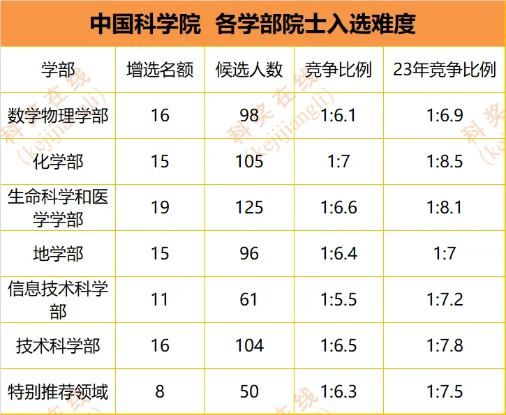 中国工程院院士增选有效候选人660人(含特别通道有效候选人43人),计划增选总名额不超过100名。中国科学院院士增选有效候选人639人(含特别推荐有效候选人50人),计划增选名额不超过100名。科奖在线统计了各学部增选名额和有效候选人的比例,基本可以反映各学部院士的竞争难度。具体统计如下: