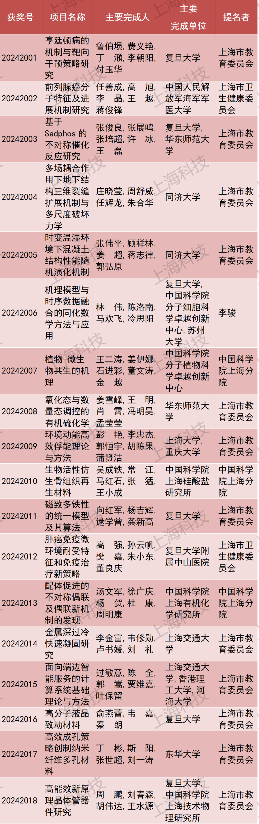 2024年度上海市科学技术奖励 完整获奖名单 (点击可查看大图) 科技功臣奖