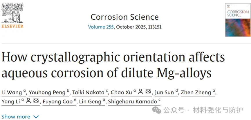 这项研究明确了晶体取向在调控局部腐蚀中的核心作用,为通过优化晶体取向分布或调整(0001)晶面间距来提升镁合金耐腐蚀性提供了直接理论依据,可通过优化晶体取向分布,或修改(0001)平面的晶面间距来减轻腐蚀沿(0001)晶面的优先传播。未来研究可进一步研究不同镁合金体系,探索晶体取向与合金元素及加工工艺的协同调控机制,推动该理论在实际工程中的应用。