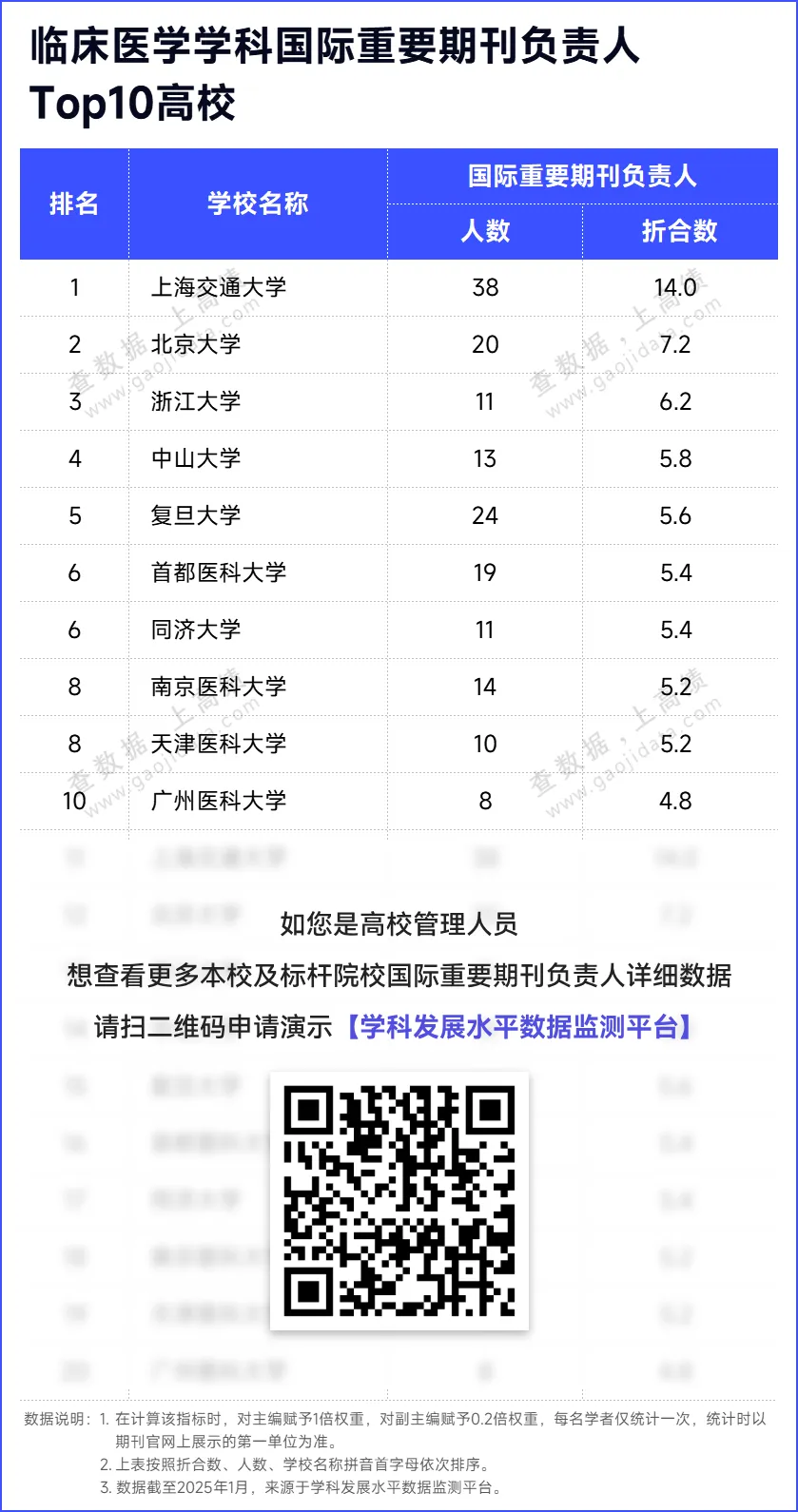 作为国际话语权的重要组成部分,国际学术话语权体现了一个国家在世界范围的学术影响力,是衡量国际影响力的重要尺度。在提升我国国际学术话语权的过程中,高校责无旁贷。国际重要期刊负责人及编委数据均来源于【学科发展水平数据监测平台】,平台实时监测350+项学科发展指标,助力学科管理人员及时掌握学科动态、客观评价学科水平、精准发现学科短板、统筹优化资源分配。授权用户可登录【学科发展水平数据监测平台】,查看本校及对标学校国际重要期刊负责人及编委详细数据。未授权用户,可以扫描下方二维码,申请演示。