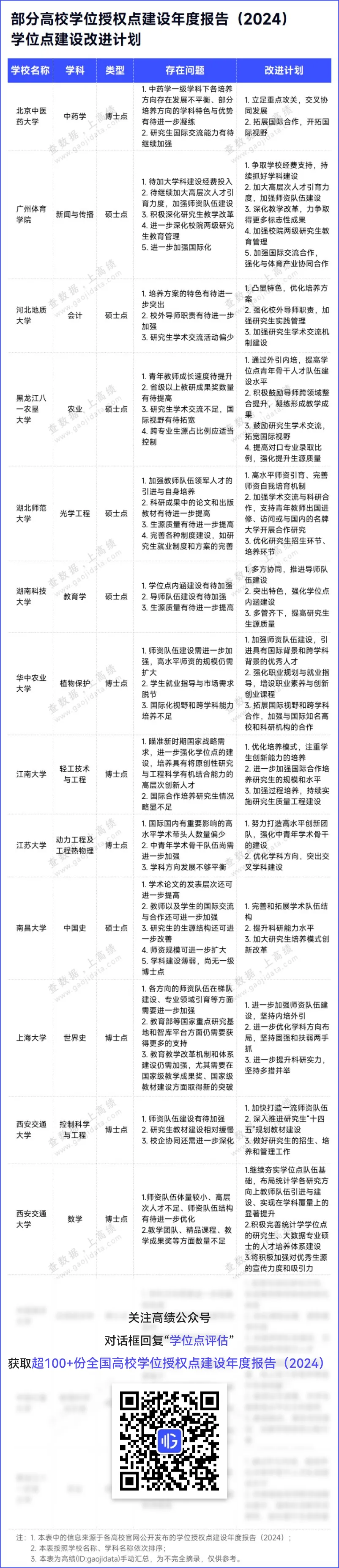 学位授权点合格评估是对现有学位授权点进行的全面“体检”,保证学位与研究生教育基本质量,打破学位授权点终身制。 为了进一步展现各高校学位点建设质量的情况,高绩(ID:gaojidata)汇总了超百份来自全国高校的2024年学位授权点建设年度报告,报告系统性地分析了该年度学位授权点建设的总体情况,以及学位授权点建设过程中存在的问题和下一步改进计划。 例如,华中农业大学的植物保护博士点,学校从师资队伍、学生就业、研究生培养能力等角度对存在问题进行深度剖析,包括师资队伍建设需进一步加强、高水平师资的规模仍需扩大; 学生就业指导与市场需求脱节;国际化视野和跨学科能力仍存在培养不足。 针对这些问题,学校也进一步提出了改进方案,包括加强师资队伍建设,引进具有国际背景和跨学科背景的优秀人才;强化职业规划与就业指导,增设职业素养与创新创业课程;拓展国际视野和跨学科合作,加强与国际知名高校和科研机构的合作等。 上海大学的世界史博士点将目光聚焦于国家重点平台和国家级奖项等方面的强化,提出教育部等国家重点研究基地和智库平台方面仍需要获得更多的支持,以及教育教学改革机制和体系建设仍需加强,尤其需要在国家级教学成果奖、国家级教材建设方面取得新的突破。 学位点合格评估,怎么评? 依据2020年11月11日国务院学位委员会、教育部最新修订印发的《学位授权点合格评估办法》(下称《办法》),新增学位授权点获得学位授权满3年后,均应当接受专项合格评估。获得学位授权满6年的学位授权点和专项合格评估结果达到合格的学位授权点,均应当接受周期性合格评估。 学位授权点应建立有学校特色的自我合格评估指标体系,对师资队伍、学科方向、人才培养数量质量和特色、科学研究、社会服务、学术交流、条件建设和制度保障等进行评价。 总体而言,学位点合格评估是对学校学位点建设水平和人才培养质量的全面检查,是一项全局性、战略性的重要工作。不仅是国家对高校学科建设水平的一次全面检阅,更是促进高校学科内涵式发展、提升人才培养质量和科研创新能力的重要契机。