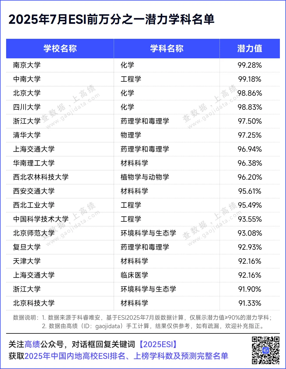 7月10日,科睿唯安(Clarivate Analytics)公布了2025年7月ESI学科排名,与5月相比,4所高校新增ESI前万分之一学科,6所高校共新增6个前1‰学科。9月ESI发布在即,哪些高校的学科有望在9月榜单中有所突破?