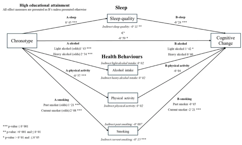 研究人员认为,在高学历者里,晚型作息与认知下滑有关,部分通过睡不好与继续吸烟这两条通道发生;而运动与酒精不是主要路径,但并不据此鼓励饮酒。