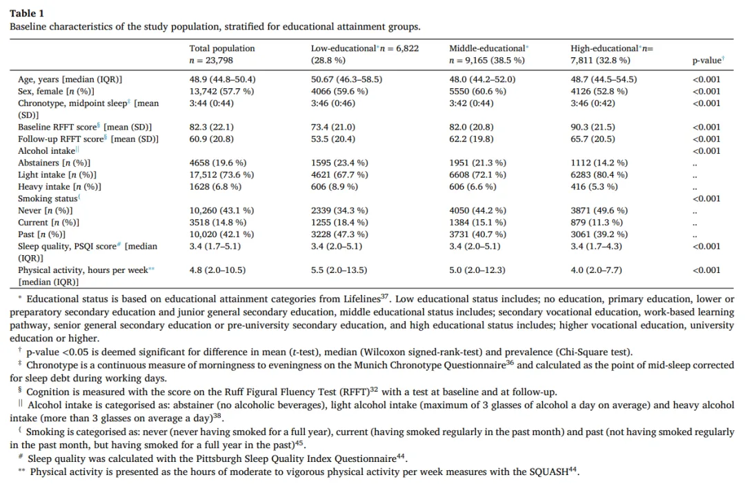 表2中显示了变量相关性。该研究证实,长期晚睡,会让认知更容易下降。