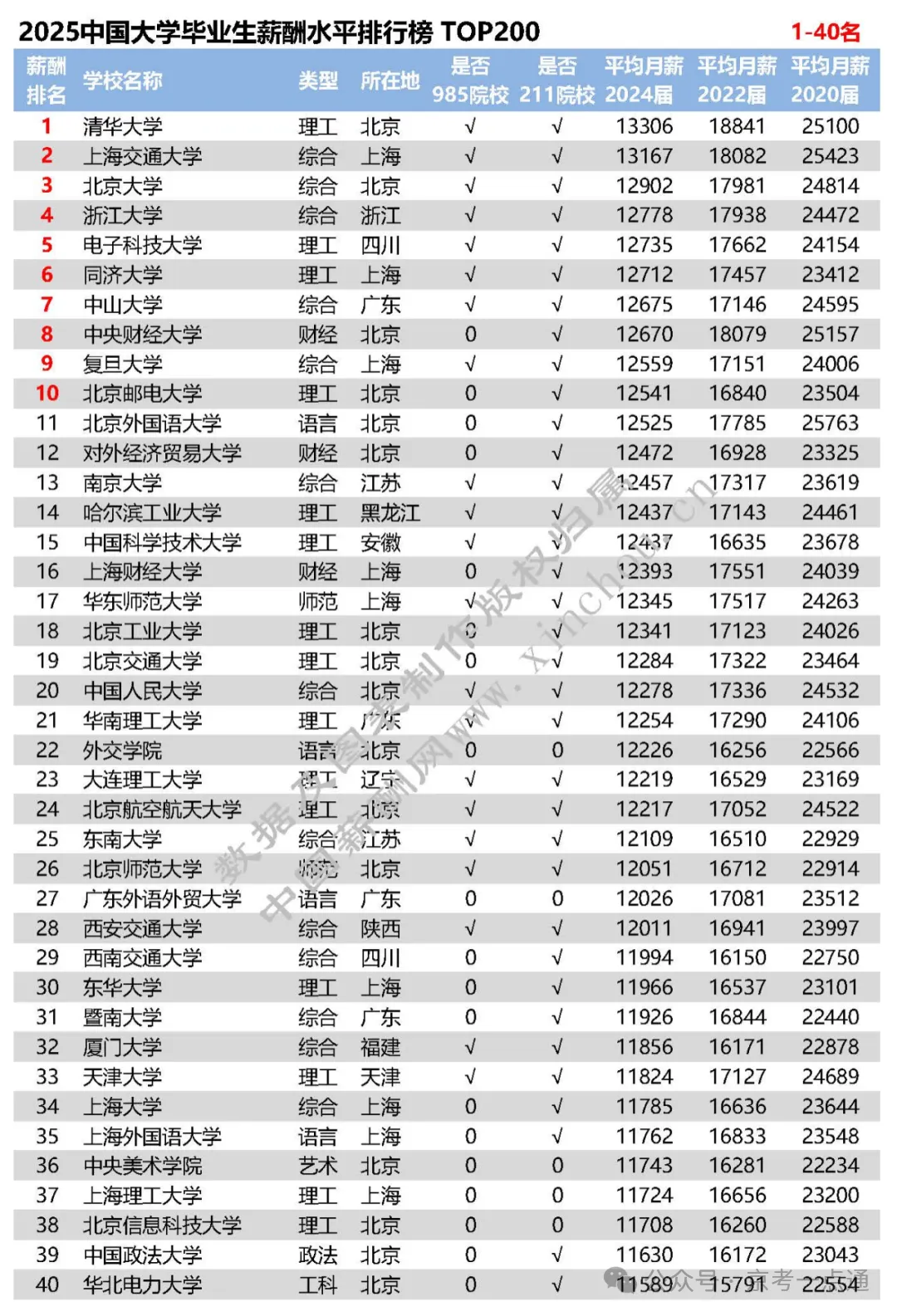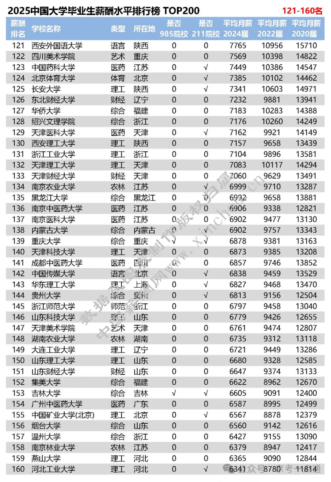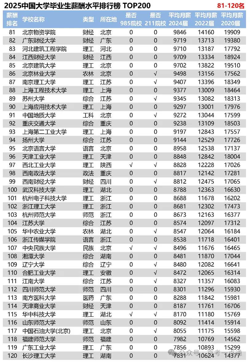 导语摘要: 高校毕业生薪酬直观反映了就业情况和历年收入变化,对毕业生就业及企业人才需求等具有重要参考意义。京考一点通(ID:bjgkzx)根据2025年全国高校毕业生薪酬排行榜TOP200,整理了最新高校毕业生薪酬情况,建议收藏本文~ 一 行业薪酬增长率排行 欢迎各位家长和同学加入【2026高考北京升学群】,群内每日分享升学动态、招录数据分析、热门试题答案等优质内容,扫码进群备考交流↓↓↓ 二 2025各高校毕业生薪酬水平 每年发布的《全国高校毕业生薪酬排行榜TOP200》采用全国各高校上年度毕业生进入用人单位满一年的薪酬数据,包括基础工资、奖金和补贴等年度总收入。 数据来源于全国各高校24届毕业生进入用人单位工作的月薪数据,包括国内300多个城市地区、400多个行业及细分领域、50多万家企业,100万多万条毕业生数据,以统计学模型计算得出。 全国高校毕业生薪酬排名既反映了各高校毕业生就业状况和历年收入变化,也反映了各高校专业学科与企业相关工作岗位的匹配程度,对客观分析高校毕业生就业趋势、企业人才需求状况,以及工作岗位发展走势具有重要参考意义。 以下为2025全国高校毕业生薪酬水平排行榜 TOP200 今年的排行榜中, 整体薪资相较于去年整体呈小幅上涨,大部分上涨幅度在100-300元左右。今年排名前200的高校,大都因专业设置符合当前经济环境和新兴行业人才需求,包括工资水平、就业率、人才成长率、薪酬增长率在内各项指标增幅均较为明显。 数据显示,985、211院校毕业生就业机会较多、就业质量较好,而且入职后薪酬水平相对较高;但是很多双非院校也表现出了它的闪光点和优势所在。