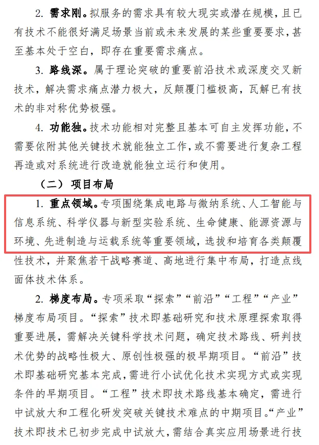 1.重点领域。专项围绕集成电路与微纳系统、人工智能与信息系统、科学仪器与新型实验系统、生命健康、能源资源与环境、先进制造与运载系统等重要领域,选拔和培育各类颠覆性技术,并聚焦若干战略赛道、高地进行集中布局,打造点线面体技术体系。