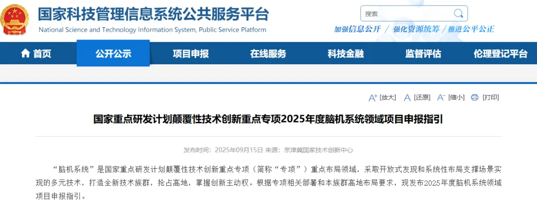 国家重点研发计划颠覆性技术创新重点专项2025年度脑机系统领域项目申报指引