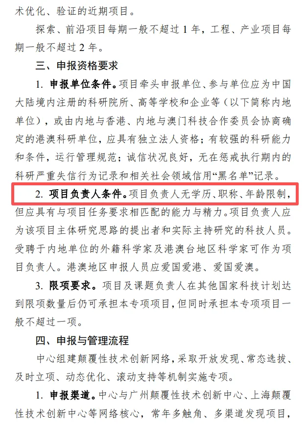 2.项目负责人条件。项目负责人无学历、职称、年龄限制,但应具有与项目任务要求相匹配的能力与精力。项目负责人应为该项目主体研究思路的提出者和实际主持研究的科技人员。受聘于内地单位的外籍科学家及港澳台地区科学家可作为项目负责人。港澳地区申报人员应爱国爱港、爱国爱澳。