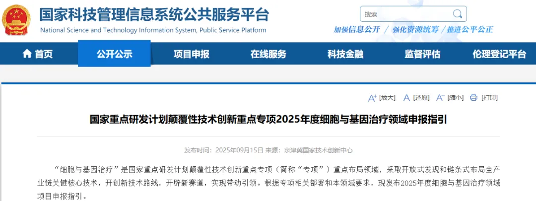 国家重点研发计划颠覆性技术创新重点专项2025年度细胞与基因治疗领域申报指引