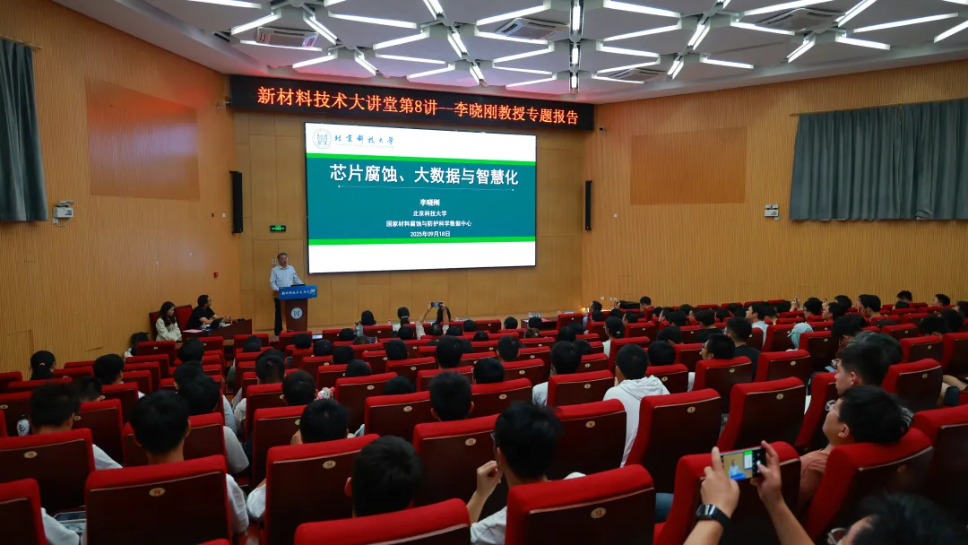 9月18日下午,新材料技术大讲堂第8讲专题报告在北京科技大学学术报告厅顺利举行。国家材料腐蚀与防护科学数据中心主任、北京科技大学新材料技术研究院教授李晓刚主讲。 北京科技大学党委教师工作部部长张俊燕,新材料技术研究院院长秦明礼,副院长董超芳、田建军、康军艳、邢华超出席本次讲座。讲座由新材院党委书记李芊主持。参加本次活动的还有来自新材院、高精尖学院的师生代表。 今年9月6日,在由教育部、中国教育学会指导,北京市委教育工委、北京市教委主办,北京市学校德育研究会承办的“为党育人、为国育才——大力弘扬教育家精神 铸魂育人 加快建设教育强国首善之区”第七届北京市大中小幼教师讲述我的育人故事展示交流活动中,我校李晓刚教授的案例《丹心砺教 报国育才 永远怀揣一颗“腐蚀心”》,荣获一等奖! 讲座开始前,党委教师工作部部长张俊燕为李晓刚教授颁发荣誉证书,并合影留念。 张俊燕部长为李晓刚教授颁发荣誉证书 李芊热情欢迎李晓刚教授做客新材料技术大讲堂,并向在座的师生们介绍了李晓刚教授在材料的自然环境腐蚀研究、耐蚀钢研发和腐蚀大数据领域的专业造诣和科研成就。 党委书记李芊主持 芯片是中美科技竞争的核心领域,我国芯片产业年增长率达12%,国产化率持续提升,但高端芯片仍是“卡脖子”问题。芯片腐蚀直接影响电子设备的可靠性和寿命,是亟待突破的关键难题。 李晓刚教授在本报告中叙述了团队在电子元器件环境腐蚀机理及主要影响因素作用规律,以及腐蚀大数据技术和装备腐蚀智慧运维等研究的最新进展。 首先,李晓刚教授指出当前芯片腐蚀面临三大难题:腐蚀问题量大面广、环境极端多变导致腐蚀动态复杂、腐蚀评价与诊断技术缺乏。因此,亟需开展电子信息材料环境腐蚀失效机理研究。目前,电子元器件向着集成化和微型化方向发展,相较于大块材料毫米- 厘米级的尺寸,IC 用材料为纳米 - 微米级。尺寸效应导致了IC用材料的耐蚀性下降500-1000倍,失效更快。 其次,李晓刚教授介绍了影响腐蚀的关键因素,包括空气湿度引发电化学失效、污染物颗粒物不同粒径以及成分差异会导致不同腐蚀机制、微生物加速PCB表面腐蚀以及加工工艺的影响。 面对腐蚀受多因素耦合作用、动态复杂,碎片数据难以获得精确腐蚀规律这一“百年难题”,李晓刚教授团队在2015年首次提出“corrosion-big-data”科学概念及其理论体系,构建了腐蚀大数据深度机器学习模型,阐明了金属材料腐蚀过程精确动力学规律,创建了结构钢耐蚀性成分数智设计新方法、新标准,实现了结构钢冶金和焊接制备工艺智慧化设计。 最后,李晓刚教授强调了发展新型高品质耐蚀芯片材料是根本,也是最先进的技术,与之相对应的材料理论创新是最前沿的理论。 李晓刚教授作专题报告 互动交流环节中,李晓刚教授以其亲切的态度与在场师生进行了深入交流,耐心倾听并细致解答大家提出的疑问。 现场交流互动 最后,秦明礼为李晓刚教授颁发大讲堂纪念牌,与会嘉宾上台并合影留念。 颁发大讲堂纪念牌 合影留念