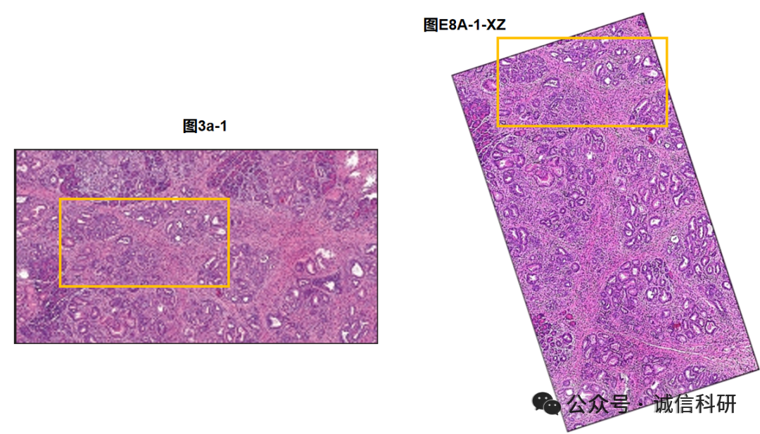 诚信科研将图1E-1与1E-3放大及调亮,同时将图1E-1进行旋转得到图1E-1-R,发现图1E-1-R与1E-3出现明显的重叠。