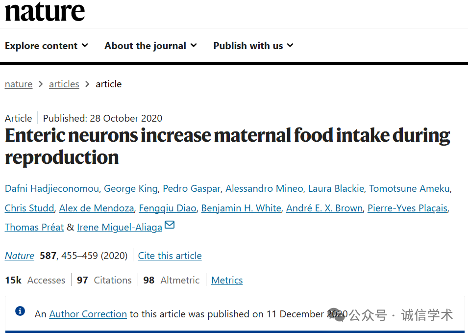 [9]诚信科研通过筛库,发现2020年12月28日,伦敦帝国理工学院Irene Miguel-Aliaga团队在Nature 杂志上发表题为“Enteric neurons increase maternal food intake during reproduction” 的研究文章(2020年12月11日对更正过一次),文章内涉嫌2对图片重复使用。