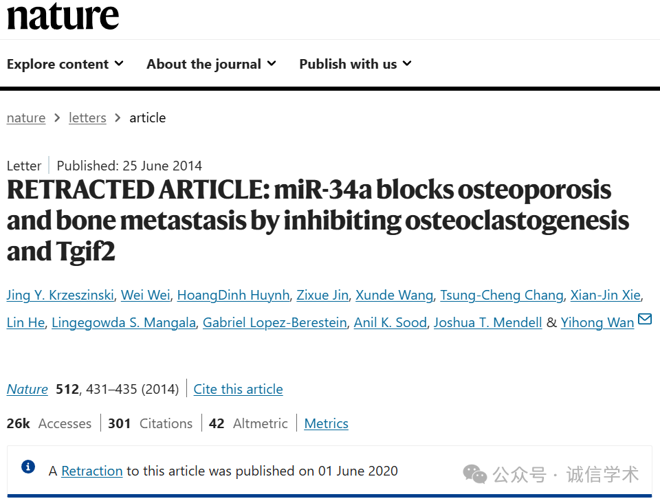 [14]诚信科研通过筛库,发现2019年8月28日,德州大学西南医学中心万一红团队在Nature 杂志上发表题为“miR-34a blocks osteoporosis and bone metastasis by inhibiting osteoclastogenesis and Tgif2” 的研究文章(2020年6月1日被撤回),文章内至少涉嫌2对图片异常使用。