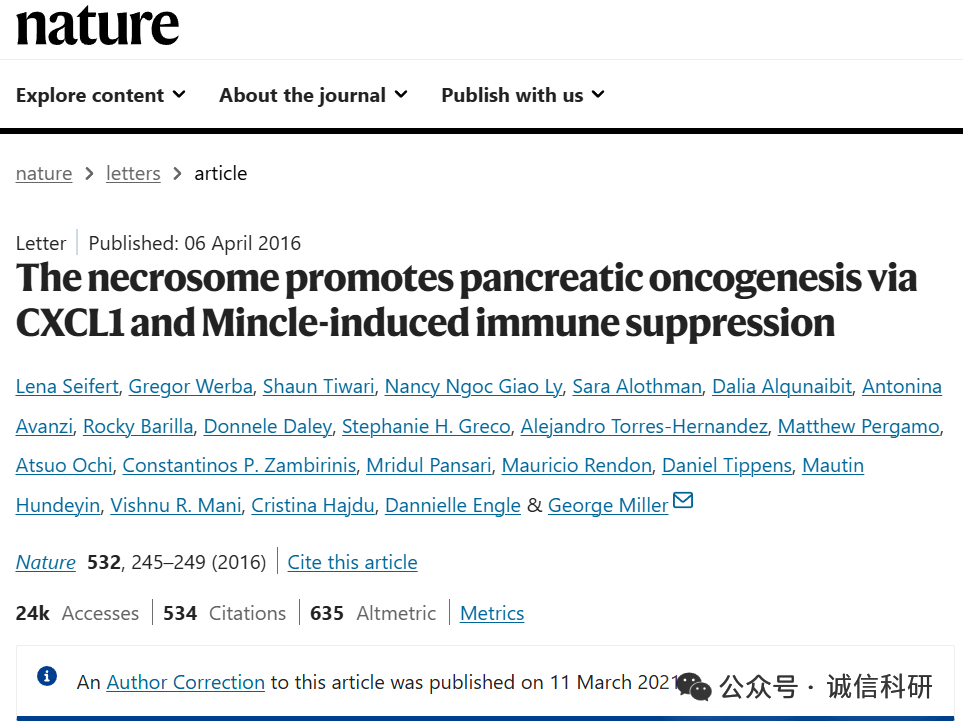 [3]诚信科研通过筛库,发现2016年4月6日,纽约大学医学院George Miller团队在Nature 杂志上发表题为“The necrosome promotes pancreatic oncogenesis via CXCL1 and Mincle-induced immune suppression” 的研究文章(2021年3月11日更正过一次),文章内涉嫌3对图片重复使用。截至到2025年8月7日,该文章已经被引用534次。