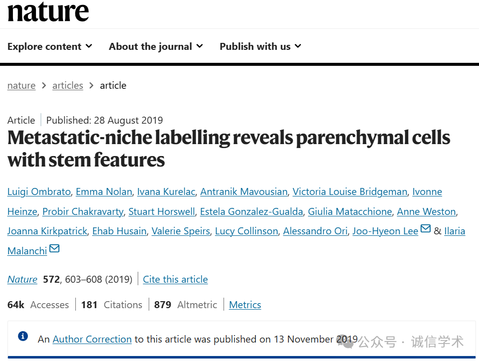 [13]诚信科研通过筛库,发现2019年8月28日,英国伦敦弗朗西斯克里克研究所Ilaria Malanchi团队在Nature 杂志上发表题为“Metastatic-niche labelling reveals parenchymal cells with stem features” 的研究文章(2019年11月13日对更正过一次),文章内涉嫌2对图片异常使用。