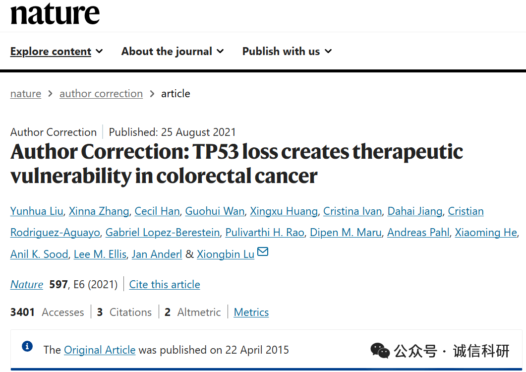 [1]诚信科研通过筛库,发现2015年4月22日,德克萨斯大学MD安德森癌症中心陆雄斌团队在Nature 杂志上发表题为“TP53 loss creates therapeutic vulnerability in colorectal cancer” 的研究文章(2021年8月25日由于图片重复更正过一次),文章内涉嫌5对图片重复使用。
