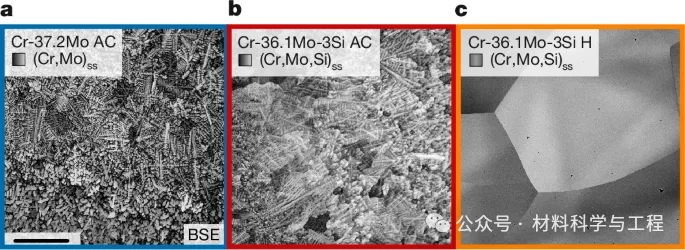 本文介绍了一种单相Cr-36.1Mo-3Si(at.%)合金,该合金首次满足耐火元件基材料的最重要关键要求:在高温下具有抗粘砂、氮化和氧化皮剥落的相关性能,最低可达1100 °C;室温下具有足够的压缩延展性。