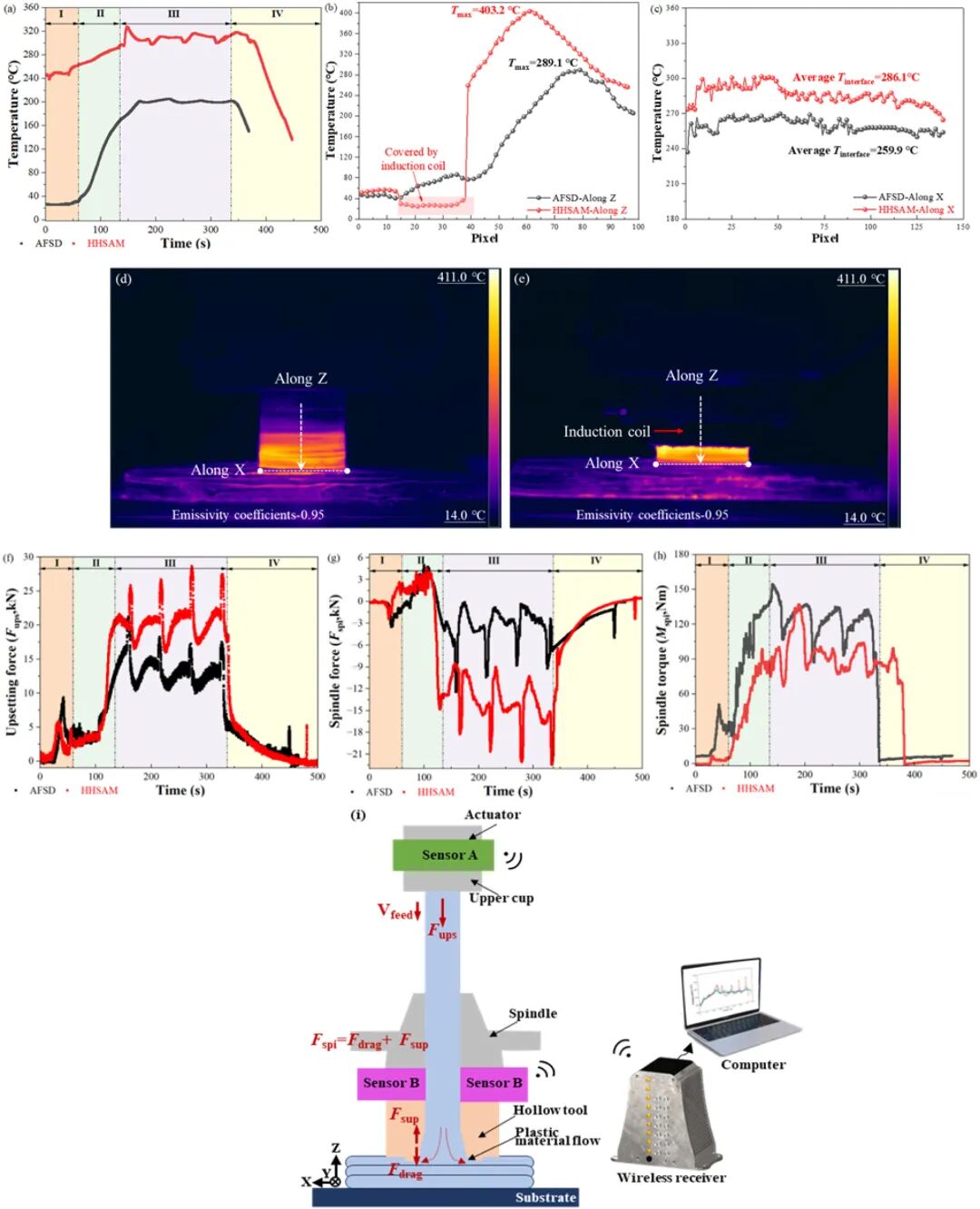 图3:通过原位过程监控套件检测到的AFSD和HHSAM的(a)温度、(f)顶锻力(F
