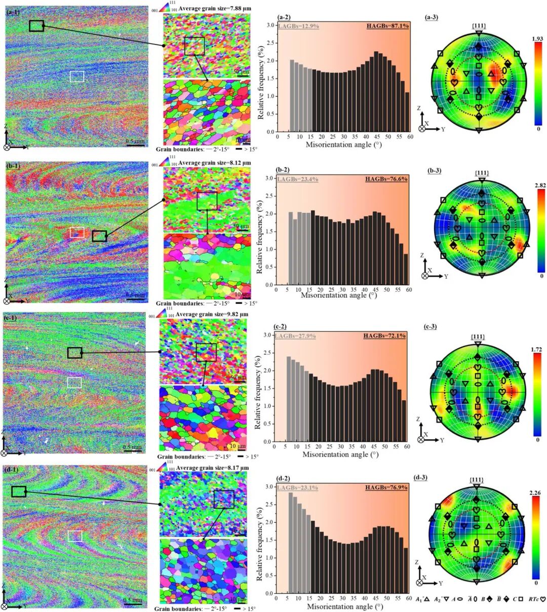 图5:(1)大范围和更高放大倍数(300倍和1000倍)的IPF图像,(2)取向差角分布和(3)(a)AFSD、(b)HHSAM、(c)AFSD-HT和(d)HHSAM-HT的PF图像。取向差角分布和PF的结果分别对应于大范围和1000倍放大的IPF图像。