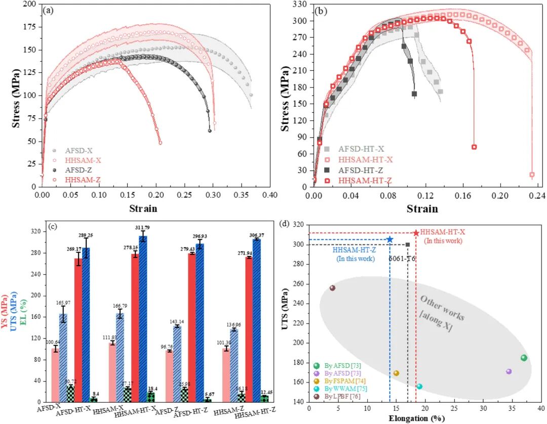 图9:沿X和Z方向的(a)制造态和(b)热处理后沉积物的应力-应变曲线比较。(c)沉积物的拉伸性能。(d)本研究沉积物与通过各种AM方法获得的沉积物的伸长率与UTS结果比较。