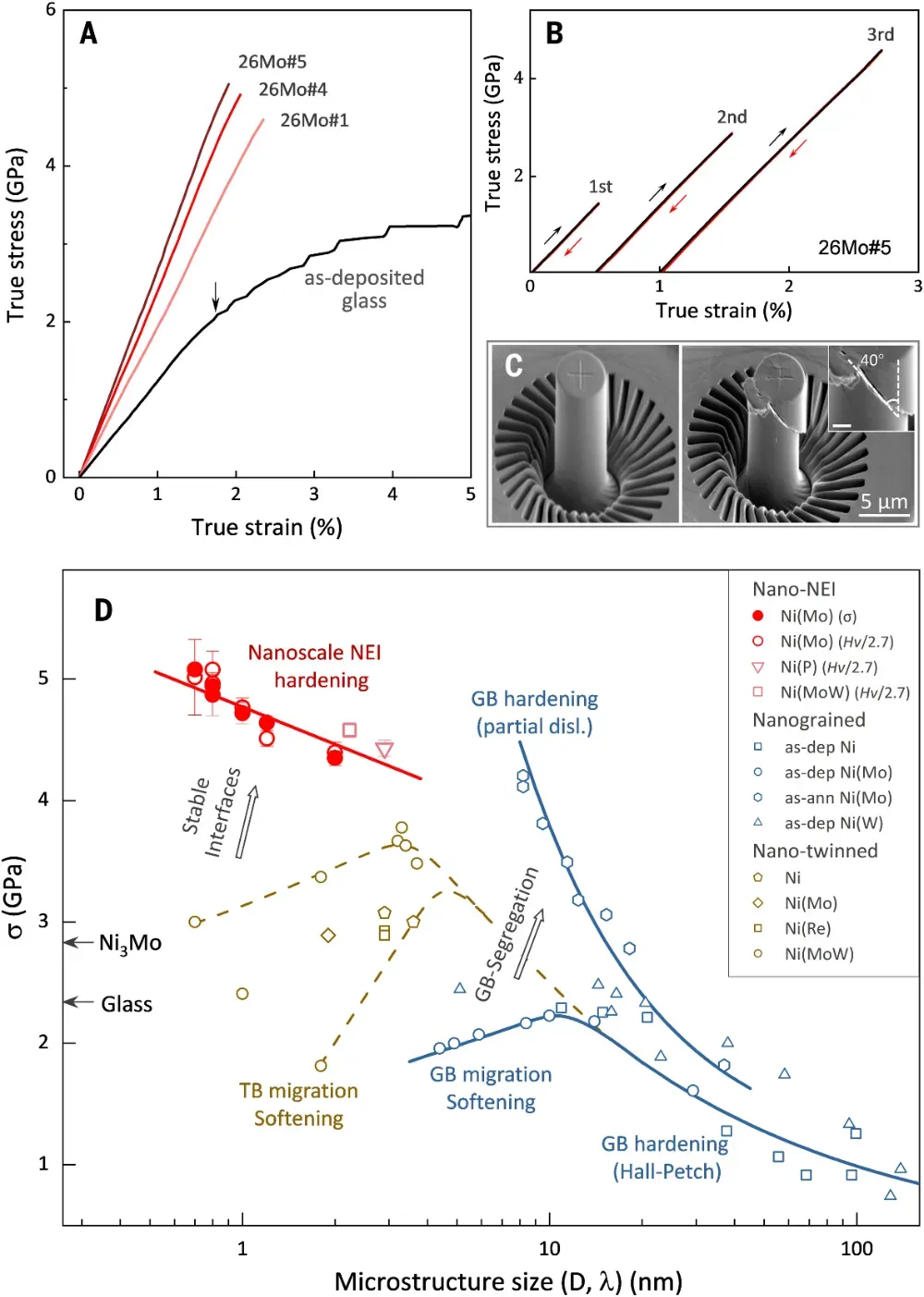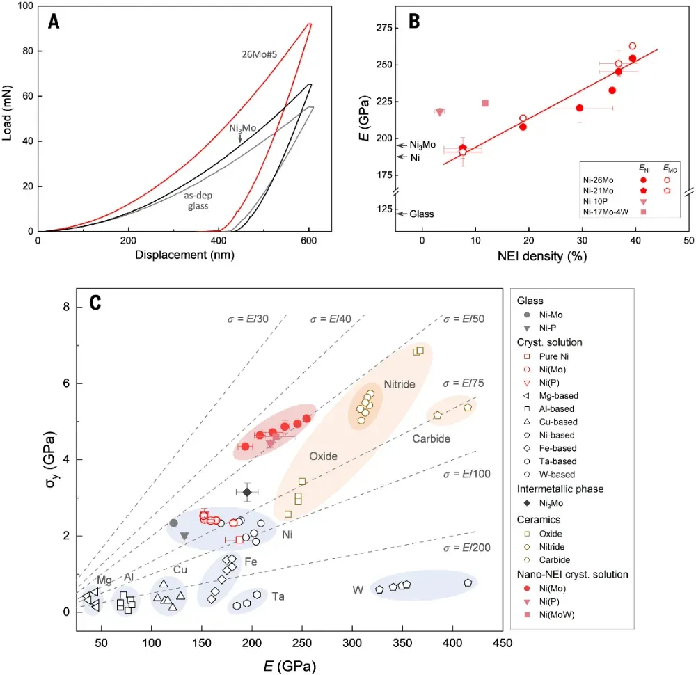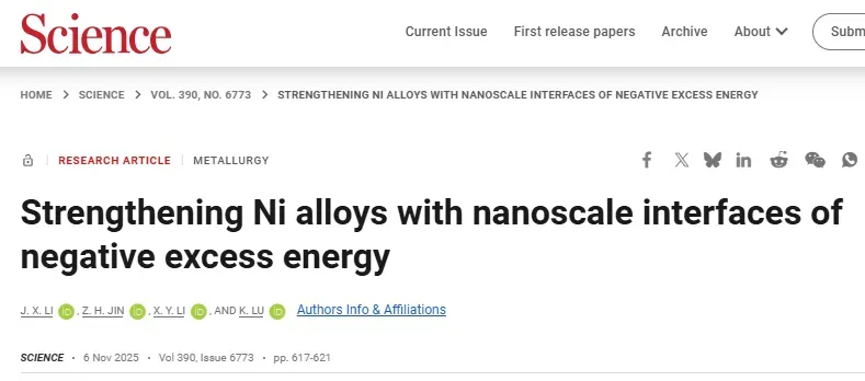 他,16岁上大学,30岁成为博士生导师,32岁任国家重点实验室主任,36岁出任中科院金属所所长;38岁当选中国科学院院士,40岁当选德国科学院院士,41岁成为《Science》首位中国评审编辑;,53岁当选美国科学院外籍院士。从本科到博士,他一直在国内接受教育,是地地道道的“中国制造”科学家。2020年,他因在纳米金属强化领域的开创性贡献荣获“未来科学大奖·物质科学奖”。他就是中国科学院院士、原辽宁省副省长、沈阳材料科学国家研究中心主任卢柯。卢柯院士长期深耕金属材料科学,率先揭示了纳米金属的变形与稳定性机制:2000年,他发现纳米铜在室温下具超塑延展性,登上《Science》;2003–2004年,再次在《Science》报道铁表面纳米化与“纳米孪晶”发现;2011年提出“梯度纳米结构”概念,实现强度与塑性的兼得;2017–2020年连续揭示纳米晶强化、热稳定性及界面结构新机制;迄今为止,他已发表14篇《Science》、1篇《Nature》,是全球金属材料领域当之无愧的领军人物。打破金属强化极限!发现“负能界面”让镍合金强度逼近理论极限!在金属材料领域,一个长期存在的难题是当晶粒细化到极限时,材料会“反而变软”。这是因为在纳米尺度下,晶界或孪晶界变得极不稳定,会滑动、旋转甚至消失,使金属失去应有的强化效果。如何在极端尺寸下仍保持结构稳定,从而进一步突破强度上限?这是材料科学家几十年来梦寐以求的目标。在此中国科学院金属研究所卢柯院士、李秀艳研究员合作在镍-钼合金中发现并构建了一类“负多余能界面”(negative excess-energy interface, NEI)。这些界面不仅不会削弱材料,反而能让晶格更稳、更强,其密度可高达每纳米一个,让金属强度逼近理论值,弹性模量达到254.5 GPa,远超所有已知镍基合金和金属玻璃。这一发现刷新了人们对金属界面能量和稳定性的传统认知,为设计超高强度金属开辟了全新方向。相关成果以“Strengthening Ni alloys with nanoscale interfaces of negative excess energy”为题发表在《Science》上,Jiongxian Li为第一作者。过去的强化手段主要依赖“细化晶粒”——晶界越多,滑移受阻越强,强度越高。但当晶粒小于约10 nm时,情况急转直下:晶界活动(迁移、旋转)主导塑性变形,导致“反Hall–Petch效应”,金属开始变软。后来人们引入低能孪晶界(TB)来延缓滑移,虽然能提高强度,但在高密度下孪晶同样会因位错作用而失稳。那么,是否存在比孪晶更稳定的界面?研究团队从理论和实验双向出发,提出一个全新概念:在特定合金体系中,若界面的形成能为负值(即“负多余能”),则这种界面将自发稳定存在,并成为天然的强化源。他们选择了钼含量高达26 at%的Ni(Mo)过饱和固溶体——钼能显著降低镍的层错能(从230 mJ/m²降至约16 mJ/m²),使得材料更容易形成致密的层错与孪晶层(图1a)。通过脉冲电沉积法制备的镍-钼合金薄片在热处理后形成了由纳米晶与层错交织构成的“密排结构迷宫”(图1b)。在透射电镜下,可以看到晶粒内部遍布高密度的层错(SF)和双晶界(TB),它们以仅0.7 nm的间距交替排列(图1c、1e),构成极为独特的纳米层状界面体系。原子级界面新相:稳定的“ABC–ABAB”混排结构常规面心立方(FCC)金属的原子层遵循ABCABC堆垛,而在镍-钼合金中,研究者发现出现了大量混合了ABAB堆垛的六方密排(HCP)层,形成了局部“FCC–HCP”共存结构(图2b)。这种结构本应不稳定,但在实验中却极为持久。统计表明,随着退火温度升高,ABAB层比例从4%增至27%,其界面占比高达39%,几乎每10个原子层就有4个是界面层(图2g)。为何这些界面如此稳定?团队利用第一性原理密度泛函理论(DFT)计算揭示了答案(图2h–l):当FCC相(D022结构)与HCP相(D0a结构)以特定取向(Shoji–Nishiyama关系)共存时,两者之间的界面能竟然为负值(–8.7至–19.5 mJ/m²)。换言之,界面的存在反而降低了体系总能量!这意味着这种“负能界面”不再是缺陷,而是促进晶体稳定的“有益结合面”。因此,在镍-钼体系中,界面越多,材料越稳、越强,这与传统金属观念完全相反。这些超高密度负能界面对材料力学性能的影响是惊人的。团队通过显微柱压缩实验发现,样品在弹性阶段应力随应变线性上升,直到约2%应变处骤然断裂,峰值应力高达5.08 GPa(图3a)。这一数值几乎接近镍的理论强度极限。更令人瞩目的是,在多次加载-卸载循环中,应力–应变曲线几乎完全重合(图3b),说明整个变形过程是可逆且无塑性流动的——材料像弹簧一样可反复承受巨大应力而不永久变形。扫描电镜显示断裂表面呈现40°倾角剪切面,典型的脆性断裂特征(图3c)。硬度测试进一步证实其强化趋势:随着界面密度增大,硬度从12.2 GPa升至13.5 GPa,远超Ni₃Mo化合物(8.4 GPa)和玻璃态样品(7.0 GPa)。绘制强度与界面间距的关系图后可见,该Ni(Mo)合金的数据点完全跳出了传统纳米晶与纳米孪晶镍的性能上限区域(图3d),形成一个全新的强化“分支”。在纳米压痕测试中,纯镍的杨氏模量约为190 GPa,而Ni(Mo)玻璃为122 GPa。随着负能界面密度增加,Ni(Mo)固溶体的模量线性提升:从207.8 GPa一路上升至254.5 GPa(图4b),不仅高于所有镍基化合物,也超过部分陶瓷和氧化物材料。值得注意的是,这种模量增强与Mo含量和制备方式无关,说明“NEI效应”是普适的物理机制。理论分析表明,层错和界面附近的原子会因非对称力场发生微畸变(约2%),并在电子结构上形成高密度局域态,显著增强键合刚度。这