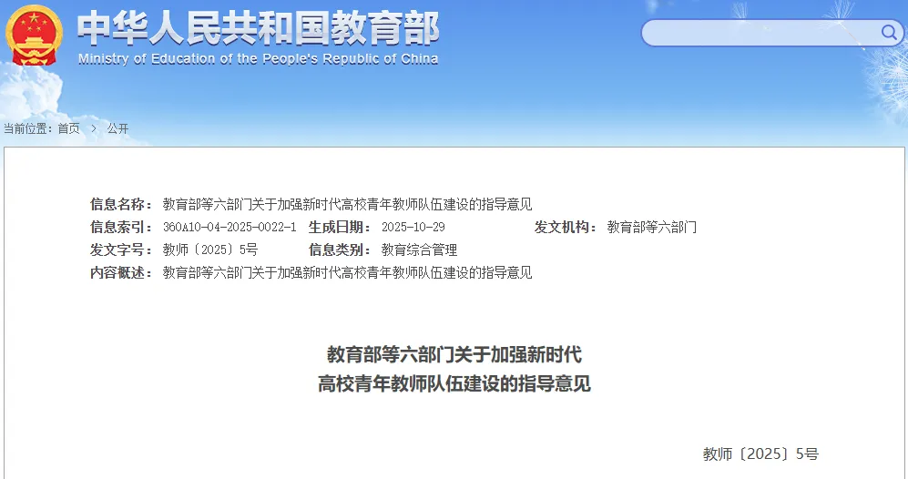 近日,教育部等六部门印发《关于加强新时代高校青年教师队伍建设的指导意见》,对支持和引导青年教师全面发展作出工作部署。其中,对高校青年教师队伍建设在师德师风、选聘机制、教师发展、考核评价、服务保障等多方面提出具体任务要求。