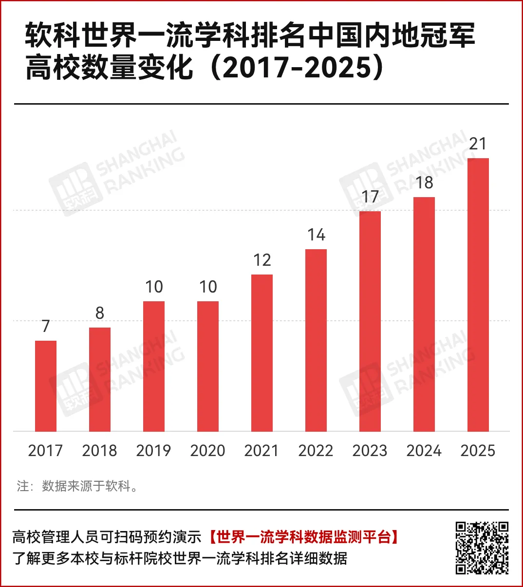 中国高校获全球冠军,是中国智慧在世界学术版图上熠熠生辉的体现。2017年以来,在软科世界一流学科排名中,中国内地冠军高校数量持续攀升,到今年已达到21个。其中,在电力电子工程(清华大学)、生物医学工程(上海交通大学)、材料科学与工程(清华大学)3个学科中国内地高校首度问鼎全球第一。