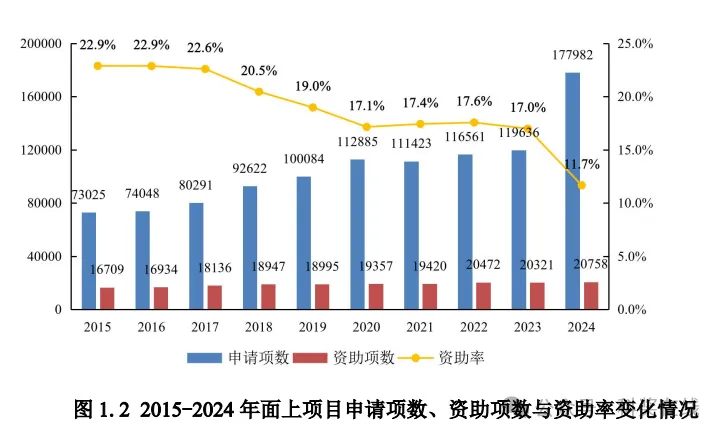 国家自然科学基金面上项目,作为集中申请期内 “量大面广” 的项目类型,是众多科研人员成长路上不可或缺的资助渠道,而且在现行评价体系中,它与不少学者的评价、晋升和考核紧密相连。关注国自然近两年来改革动态的人都清楚,2024 年是面上项目取消 “申二停一” 等改革举措的第一年。这一变动直接导致申请量 “飙升”,也是去年面上项目资助率(11.7%)跌至历史最低点的主要缘由。
