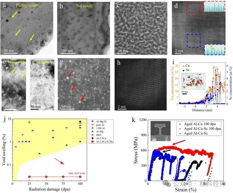 这一相变不仅逆转了传统铝铜合金的沉淀顺序,更使材料在承受高达100 dpa的辐射剂量后几乎不产生空洞肿胀,同时强度和塑性还得到同步提升。