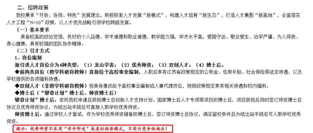 《南京信息工程大学高层次人才招聘启事(2025年)》中明确,优秀师资不采用“非升即走”或类似招录模式,不实行竞争性淘汰。