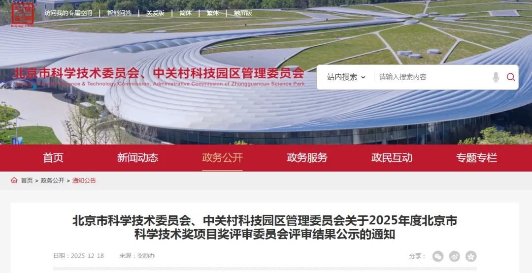 根据《北京市科学技术奖励办法》及《北京市科学技术奖励办法实施细则》有关规定,现对2025年度北京市科学技术奖项目奖评审委员会评审结果进行公示,并将有关事项通知如下: