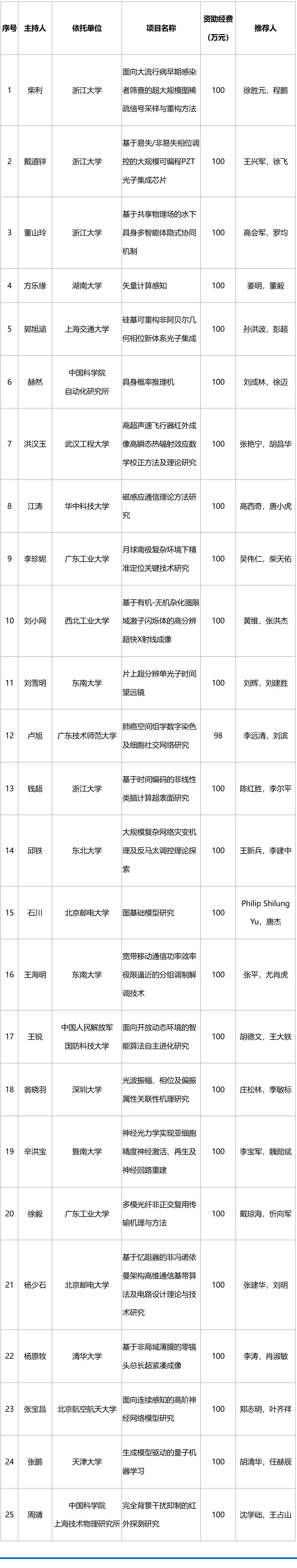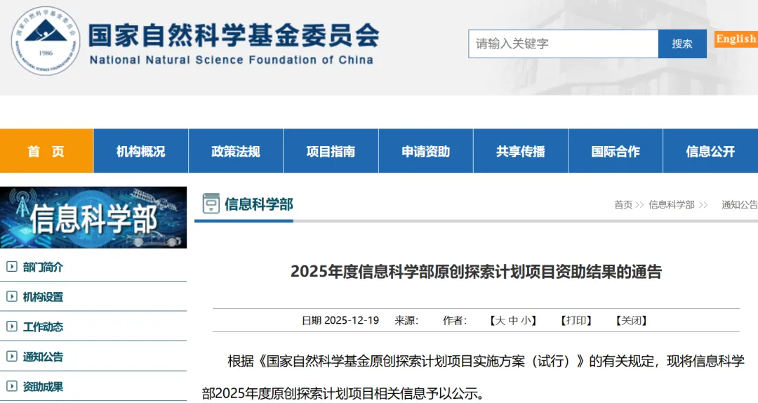 2025年度信息科学部原创探索计划项目资助结果公示