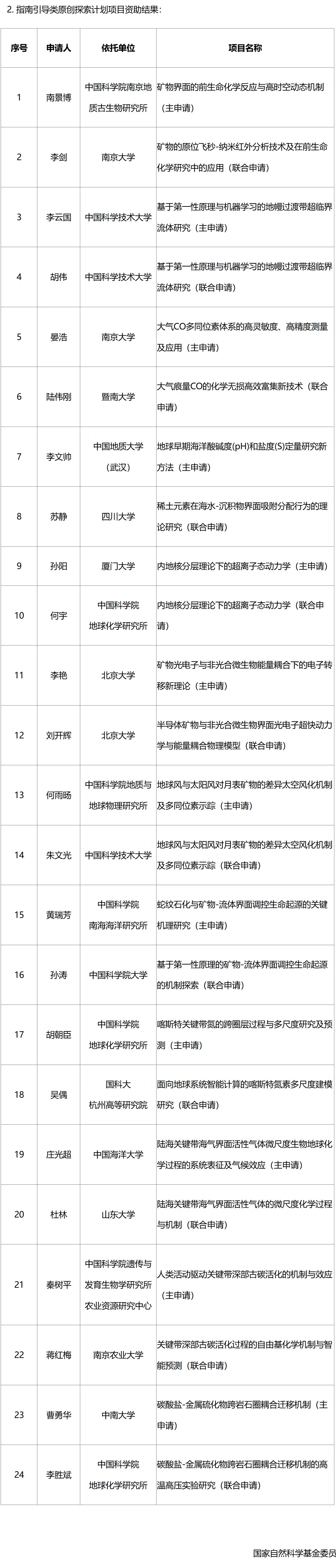 2025年度地球科学部原创探索计划项目资助结果公示