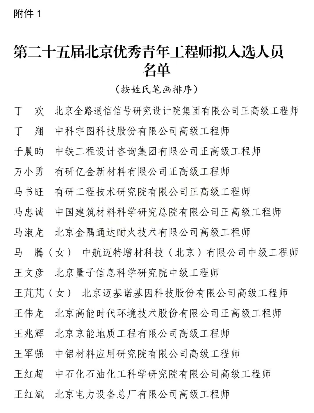 按照《北京优秀青年工程师评选表彰工作方案》,北京市科学技术协会、北京市人力资源和社会保障局联合开展第二十五届北京优秀青年工程师评选表彰工作。经推荐、评审、考察,丁欢等229人拟入选第二十五届北京优秀青年工程师,丁一等19人拟入选第二十五届北京优秀青年工程师标兵。