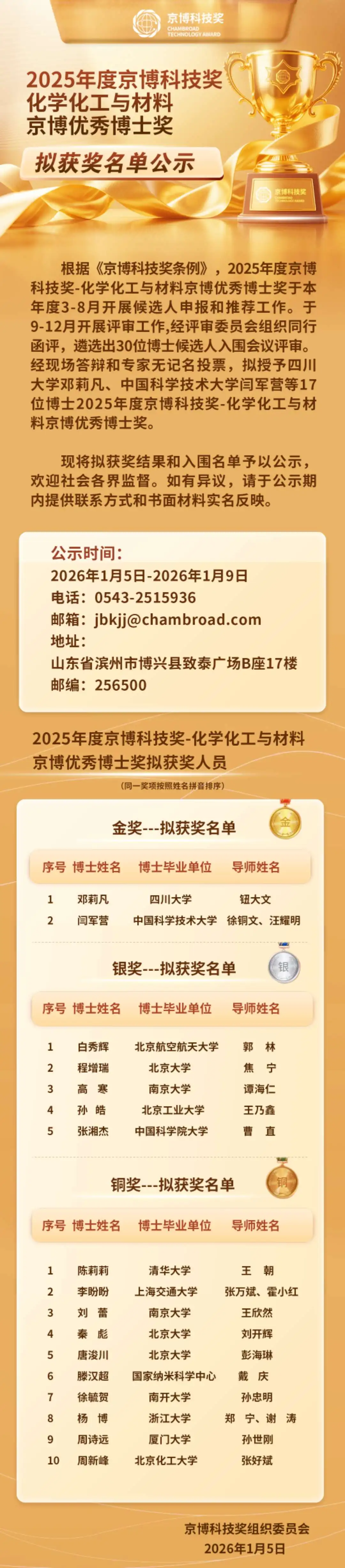 2025年度京博科技奖 - 化学化工与材料优秀博士奖拟获奖名单公示