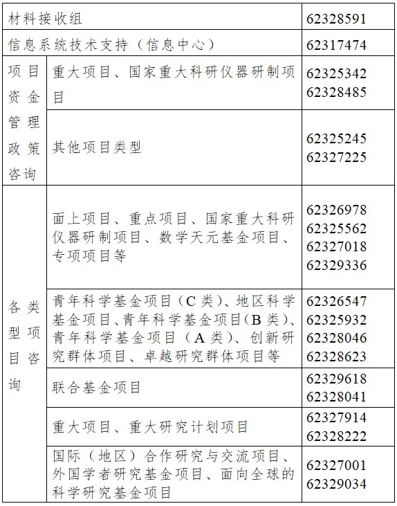 (三) 相关网站地址。 自然科学基金委官方网站: https://www.nsfc.gov.cn 科学基金网络信息系统网站: https://grants.nsfc.gov.cn 国家自然科学基金大数据知识管理服务平台: https://kd.nsfc.cn 国家自然科学基金开放获取仓储平台(OAR平台): https://oar.nsfc.cn (四) 材料接收组联系方式。 通讯地址:北京市海淀区双清路83号自然科学基金委项目材料接收工作组 邮政编码:100085 联系电话:010-62328591 国家自然科学基金委员会 2026年1月14日