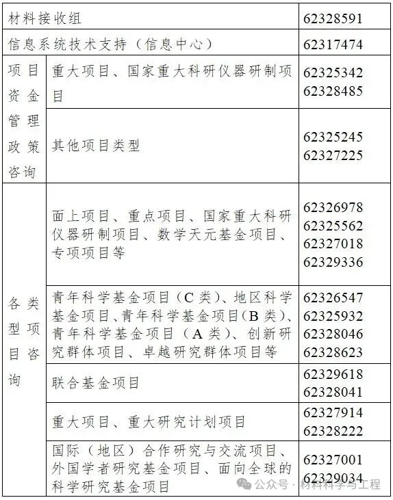 (三) 相关网站地址。 自然科学基金委官方网站: https://www.nsfc.gov.cn 科学基金网络信息系统网站: https://grants.nsfc.gov.cn 国家自然科学基金大数据知识管理服务平台: https://kd.nsfc.cn 国家自然科学基金开放获取仓储平台(OAR平台): https://oar.nsfc.cn (四) 材料接收组联系方式。 通讯地址:北京市海淀区双清路83号自然科学基金委项目材料接收工作组 邮政编码:100085 联系电话:010-62328591 国家自然科学基金委员会 2026年1月14日