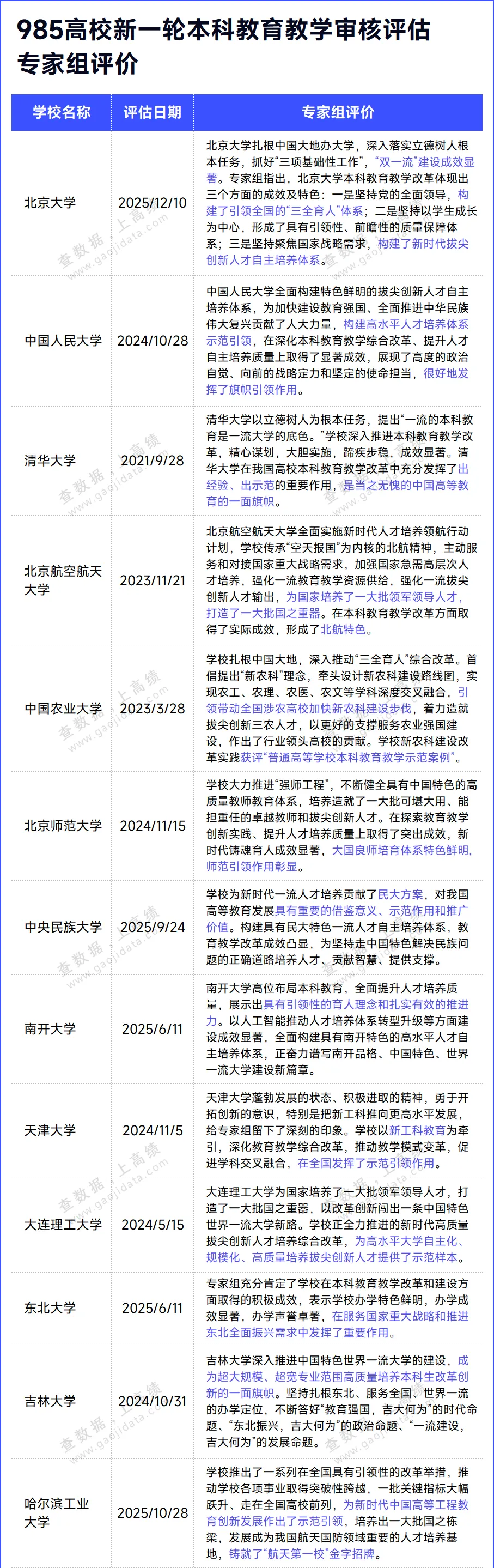 985高校作为本轮审核评估的第一类高校,世界一流大学建设、服务国家重大战略等方面受到专家组高度评价。如清华大学在我国高校本科教育教学改革中充分发挥了出经验、出示范的重要作用,是当之无愧的中国高等教育的一面旗帜南京大学中国农业大学获评“普通高等学校本科教育教学示范案例”天津大学新工科教育在全国发挥了示范引领作用等。985高校新一轮审核评估专家组评价如下: