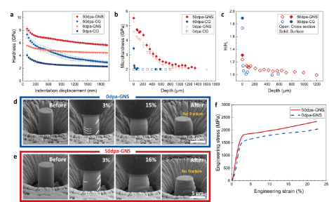 ✦ 梯度纳米结构制备与 辐射诱导缺陷的形成 ✦ 本文以核级304奥氏体不锈钢304NG为研究对象,先给出粗晶(CG)对照样品的初始组织特征,主体为奥氏体并含少量马氏体,晶内仅有少量位错与层错。在此基础上,作者采用表面机械滚压处理在表层构筑梯度纳米结构层。该梯度层并非简单细晶化,而是形成以Σ3(111)低能界面为骨架、并伴随高密度层错和位错网络的缺陷网络结构,为后续辐照过程中的缺陷调控提供结构底座。 辐照实验采用粗晶与梯度纳米结构样品(GNS 304NG)在相同框架下对比。室温工况重点观察位错环这一典型低温辐照缺陷,并将最大剂量提高到155 dpa以检验极限耐受能力;同时设置450 ℃约80 dpa的高温工况用于评估空洞等重组缺陷,以对应更接近工程场景的风险。缺陷的形貌与密度主要通过TEM成像与统计获得,并结合衍射与相分析手段跟踪辐照后的结构演化。 图 1 GNS 304NG样品的微观结构 图 2 CG和GNS 304NG样品在室温下的耐辐射性 ✦ 抗辐射机制解析 ✦ 室温155 dpa后,粗晶样品形成高密度位错环,而梯度纳米结构样品中位错环显著受抑。定量统计显示,梯度纳米结构样品在155 dpa时位错环密度仅约为粗晶对照的3.8%。在高温450 ℃约80 dpa条件下,粗晶样品出现大量空洞,而梯度纳米结构样品中空洞几乎难以观察到,说明优势不仅体现在位错环,也延伸到相关的空洞缺陷。 在机制层面,作者指出仅靠晶界吸收缺陷不足以解释早期阶段位错环密度随剂量上升反而下降的反常趋势,并将核心归因于梯度纳米结构中更易触发且可扩展的辐照诱导马氏体转变。文中给出证据表明马氏体转变在低剂量阶段就被明显激活,并呈现从峰损伤区域向周围区域扩展的行为,因此提出大尺度自适应马氏体转变这一概念。高分辨观察显示相变倾向于在层错附近起始,指向层错与辐照缺陷耦合降低相变门槛;作者进一步强调,相变推进伴随晶格重排过程本身可能消耗大量辐照缺陷,从而显著增强抗辐照能力,并结合分子动力学模拟对这一过程进行支撑。 图 3 辐照下GNS 304NG样品中的马氏体相变过程 ✦ 机械性能验证 ✦ 除了缺陷密度的降低,文章还指出,提升抗辐照性能不仅要压低缺陷,也要避免因微结构演化而牺牲服役力学性能。为此,文中通过纳米压痕与原位微柱压缩对辐照后的力学响应进行评估,并记录变形过程以判断塑性稳定性。微柱压缩实验中,辐照后的微柱仍可压缩至约22%工程应变,用于对比辐照前后的应力应变响应与变形形貌。 论文指出,这类由低能界面、高密度层错与位错网络构成的结构底座,有望在降低辐照缺陷的同时维持并改善反应堆服役钢的综合力学表现。 图 4 辐照样品的机械性能(室温下约50 dpa)