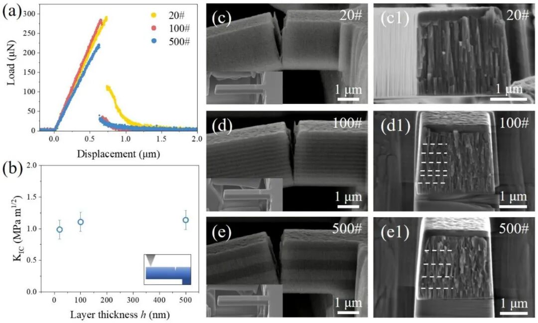 图5. 微悬臂弯曲试验中20#、100#和500#的载荷-位移曲线(a)及计算的断裂韧性(b);(c-e1)20#至500#中断裂面的侧视图和前视图。插图为加载前的微悬臂形貌。