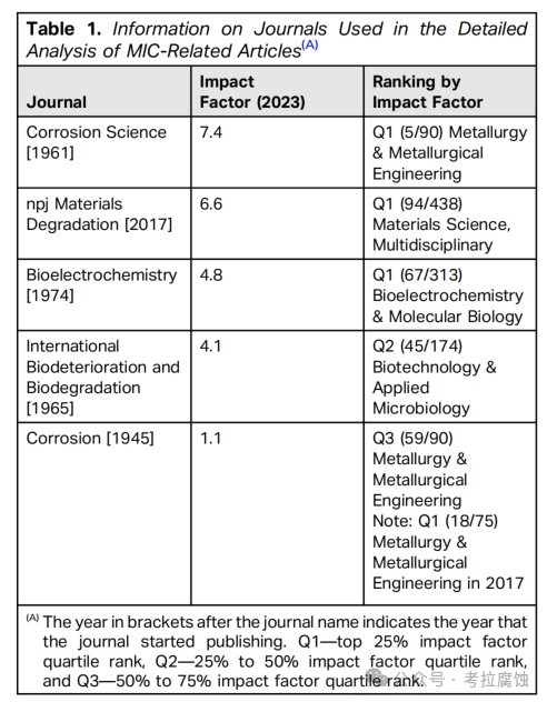 选择了五个科学期刊——Corrosion Science、npj Materials Degradation、Bioelectrochemistry、International Biodeterioration and Biodegradation和Corrosion,以分析MIC相关研究文章的详细内容。这些期刊基于它们历史和/或最近发表MIC文章以及在影响因子和分组主题类别中的相对高排名选择(见表1)。然后使用每个期刊网站上的搜索功能查找和下载该期刊包含“microbiologically influenced corrosion”或“microbial corrosion”或“microbially induced corrosion”的所有文章。然后手动扫描每篇文章以找到感兴趣的信息。每个期刊的期刊细节和研究文章数量提供在表2。总共考察了229篇文章,每个感兴趣时期至少60篇文章。