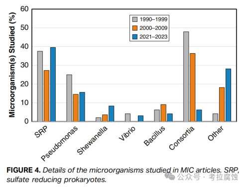 如图4所示,硫酸盐还原原核生物(SRP)一直是感兴趣期刊中MIC文章研究和报告的主要微生物类型之一,在本工作调查的不同时间范围中一致。测试中使用的硫酸盐还原原核生物鉴定 specificity 从现场分离的不指定硫酸盐还原细菌到特定培养收集株,后者随时间更常见。研究的主要SRP属是Desulfovibrio desulfuricans和Desulfovibrio vulgaris,以类似速率报告。Pseudomonas sp.是研究第二高的微生物属。