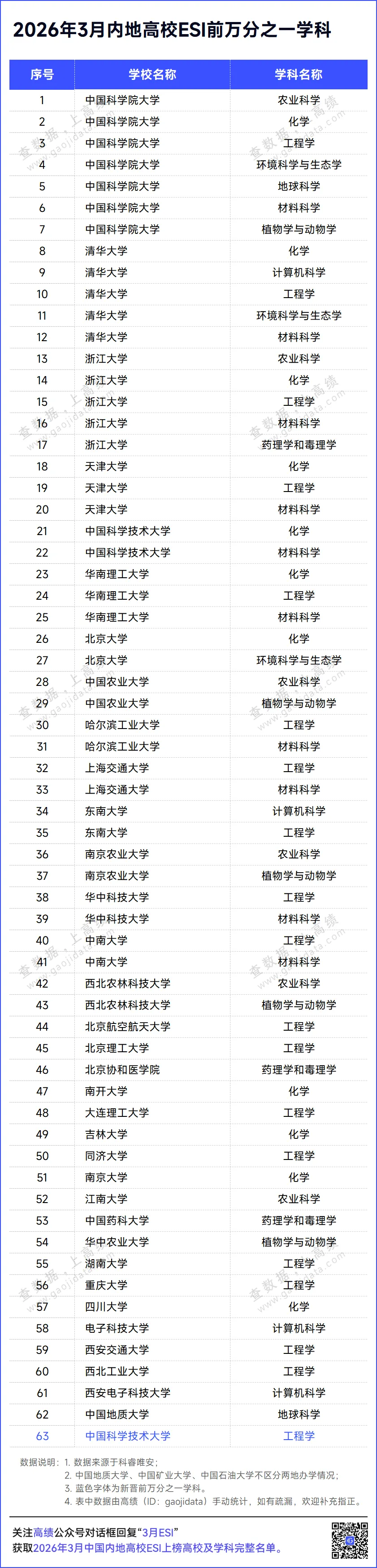 相比2026年1月公布数据,在最新的ESI排名中,中国科学技术大学的工程学进入全球前万分之一。内地高校目前共有全球前万分之一学科63个。