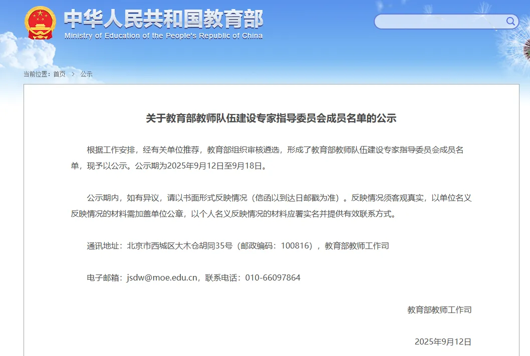 "9月12日,教育部发布《关于教育部教师队伍建设专家指导委员会成员..."