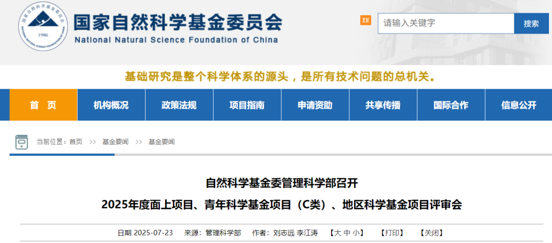 "7月16日至18日,自然科学基金委管理科学部2025年度面上项目、青年..."