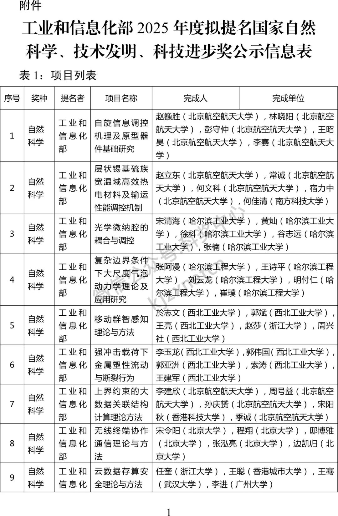 工信部:提名2025年度国家科学技术奖候选项目公示