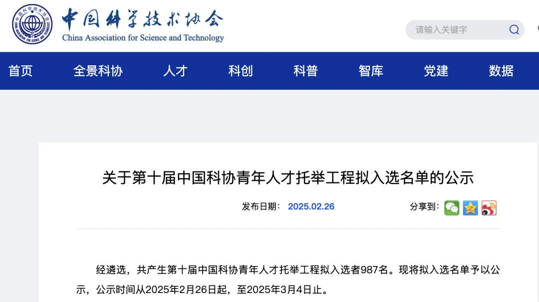 "2月26日,中国科学技术协会官网发布了关于第十届中国科协青年人才..."
