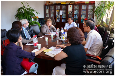 李晓刚主任首先向来宾表示欢迎并介绍了中国腐蚀与防护领域发展的总体情况,特别介绍了在汽车和建筑行业的防腐市场前景,并提出和NACE建立双边合作机制,以及共同举办汽车腐蚀与防护高端论坛,希望加强与NACE的培训合作,拓宽培训范围。张钦京介绍了中国腐蚀与防护学会在阴极保护(CP1-CP4)课程培训情况,希望在其它腐蚀课程的培训上进一步开展合作。