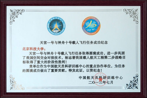 为表彰国家材料环境腐蚀平台为我国载人航天事业所做出的突出贡献,2014年3月29日,中国航天员科研训练中心全体领导向李晓刚教授团队颁发了“天宫一号与神舟十号载人飞行任务成功”重大贡献纪念牌匾,由此,挂靠在北京科技大学的国家材料环境腐蚀平台成为中国航天员科研训练中心信得过的有重大贡献的重点协作单位。李晓刚教授接受纪念奖牌后表示:“国家材料环境腐蚀平台全体项目科研人员深受鼓舞,感到无尚光荣,能够以一名材料腐蚀科技人员的身份参与我国载人航天伟大事业,这首先是国家材料环境腐蚀平台的荣誉,是国家科技条件平台中心大力领导和支持的结果。同时,也是我们团队多年来默默无闻工作,艰苦努力历练换来的,是国家对我们工作的最大认同与鼓励。我们将继续加强与中国航天员科研训练中心协同合作,凭借所学所能和不懈努力,为中国载人航天工程下一步战略目标的实现努力工作,做出更大的贡献。”